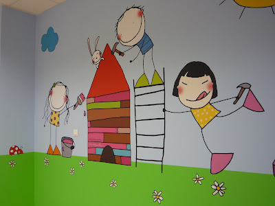 Fin de semana en Zaragoza, para ver la expo del agua (que ya colgaré fotos), que muy chula, pero un calor... me dió una lipotimia que pensé que me moría, eso sí salí concienciada a muerte de que hay que ahorrar agua, pero el verdadero objetivo de ir era decorar el cuarto de Lucía que nacerá (esperemos) muy, muy prontito.Allí estabamos Eli (la mamá), Chema (el papá), el tío Dani (el creador de nubes), Mario (mi triatleta y primo de Eli y Dani) y yo. La habitación quedó preciosa, a la vista está, y por primera vez en un cuarto se combinaron pegatinas con pintado, y con muy buen resultado... creo que empezaré a pasarme a las pegatinas (vinilos impresos + con plastificado mate) para decorar cuartos, es más , más sencillo y muy rápido. Espero que Lucía, cuando salga, se sienta tan feliz como ahora en su casa redondita y que su nuevo cuarto le dé la misma alegría y felicidad que ahora su mamá.